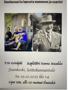 Juankosken Soittokunnantalolle, Juankoskentie 9 A, sunnuntaina 19.10.2025 klo 14. Liput 10 €, väliajalla kahvio.