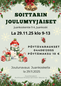 Juankosken joulunavaus ja Soittarin joulumyyjäiset Kirjoittaja Anne KekäläinenJulkaistu 4.11.2025 Pöytävaraukset voi tehdä soittamalla 0440612055. Pöytämaksu on 10 €.